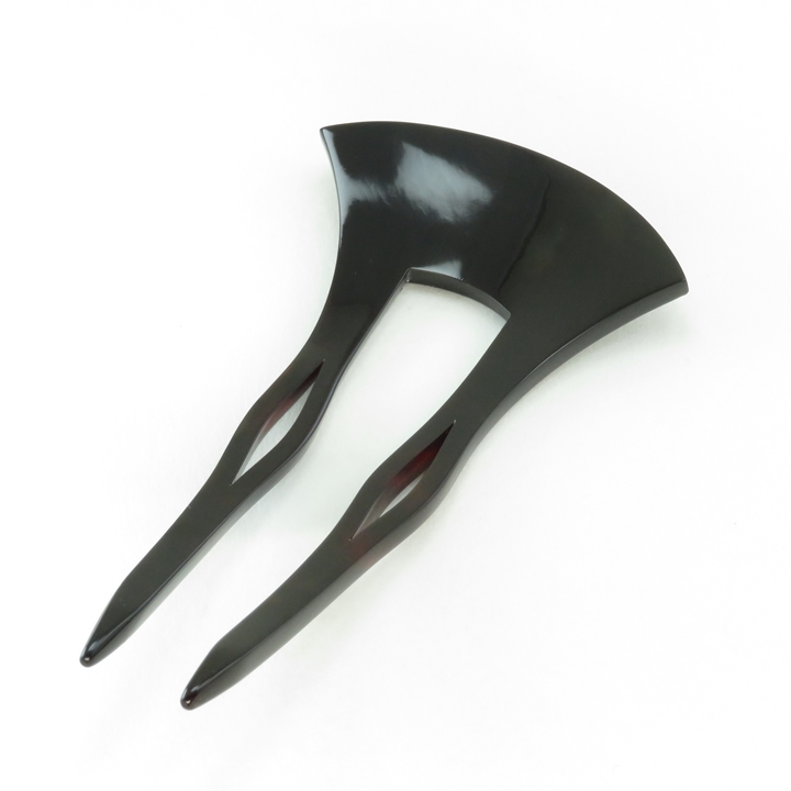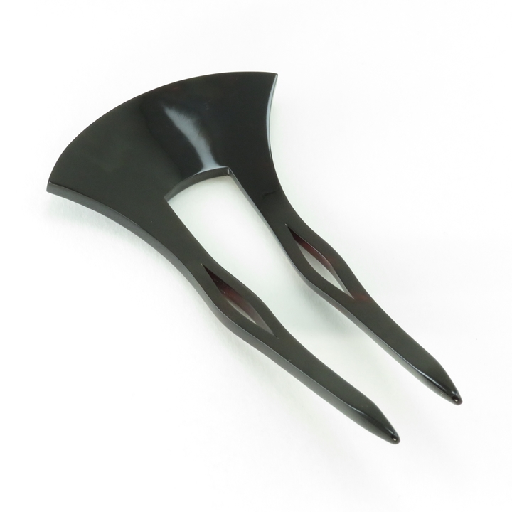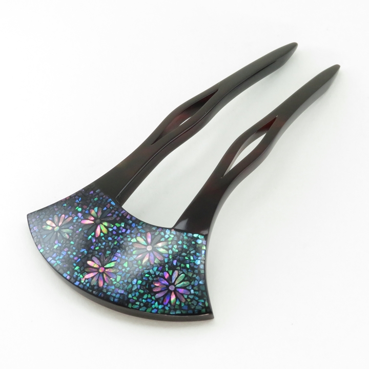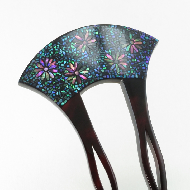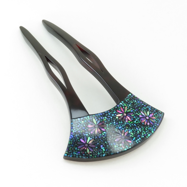 鼈甲螺鈿簪のお品になります。さりげなく菊の花が打ち出し螺鈿で施され、周囲を割貝螺鈿で詰めています。けっして派手ではないところがこのお品の良さと言えます。菊文には「長寿、無病息災、邪気払い、高貴」などの意味があり、縁起の良い吉祥文として季節問わず御使用いただけます。髪に挿す事、また身につけ動く事により、細かい貝が上品に光り輝きます。黒留袖からお洒落な装いとしまで幅広く御使用いただけます。