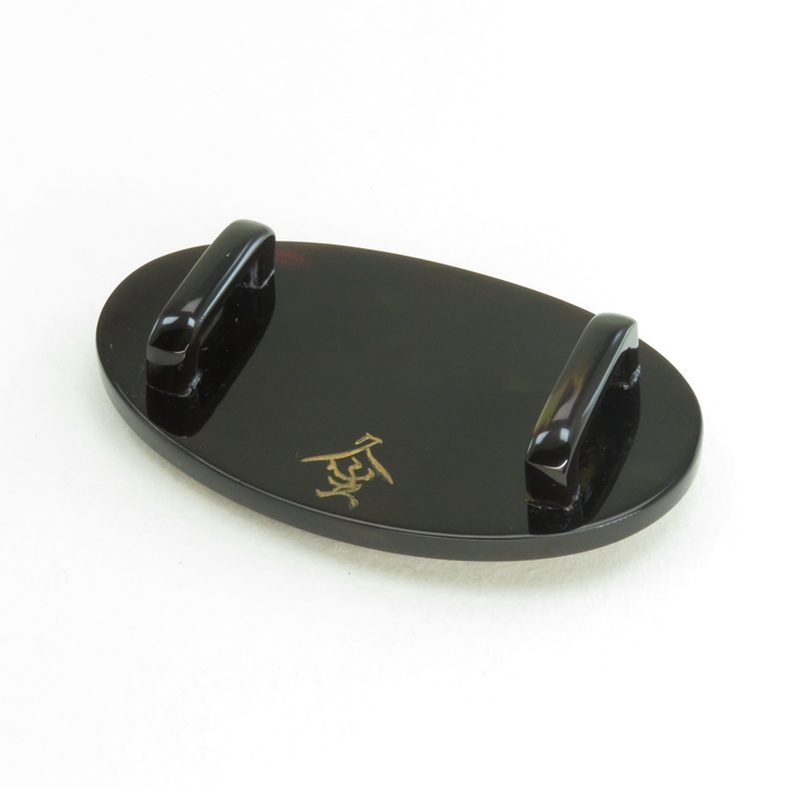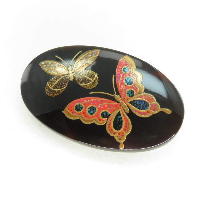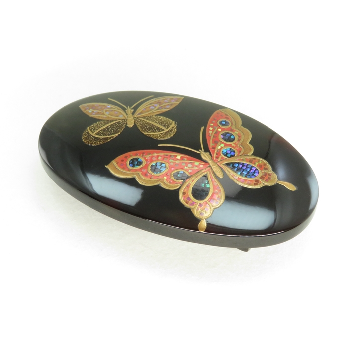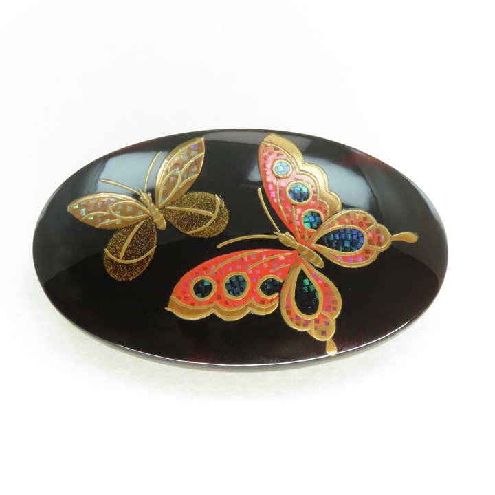 鼈甲螺鈿蒔絵帯留め 蝶のお品です。花鳥風月を得意とした良生氏を師事、久生(きゅうせい)のお品になります。二匹の蝶が優雅に舞っている姿を描いております。留袖からお洒落着まで、どのようなシーンでも御使用いただけます。[螺鈿蒔絵]とは、小さく切り出した色の綺麗な貝のみ選び、竹を尖らした先端で一つ一つ漆の上に置いていき金粉を蒔き、専用炭で研ぎあげる[研出蒔絵]技法で、鼈甲と共に時代を歩んできた代表的お品です。身に着け動く事により、金の中の細かい貝が上品に光り輝きます。【ワシントン条約により鼈甲材料の枯渇、金の高騰、職人の減少等が続いております。もとよりお安い価格設定となっております】